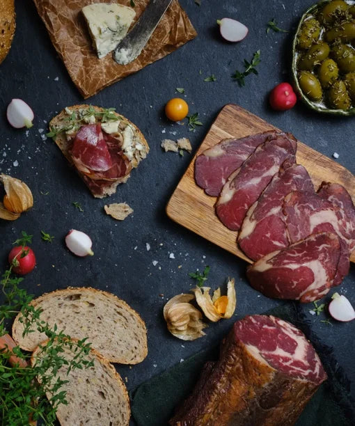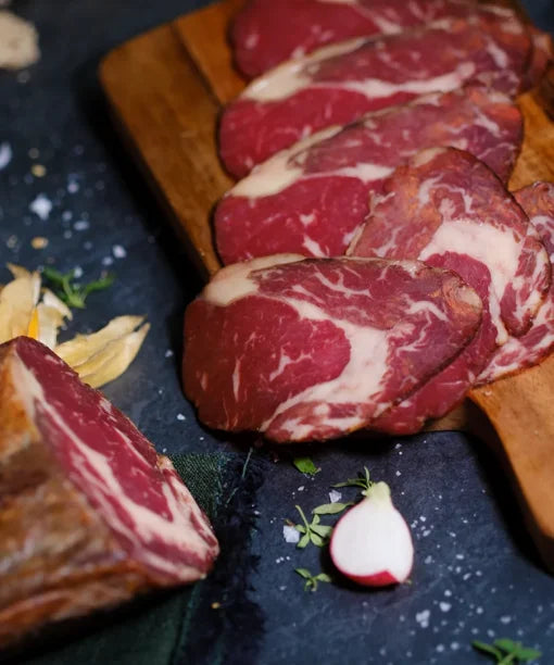 Pažljivo odabranim komadima goveđeg mesa osiguravamo najviši kvalitet za svaki odrezak, zbog čega je naš suhi ramstek često popularan izbor za svečane prilike i gurmanske obroke. Rezultat ovog procesa je autentičan, složen i bogat okus govedine s blagim orašastim tonovima.